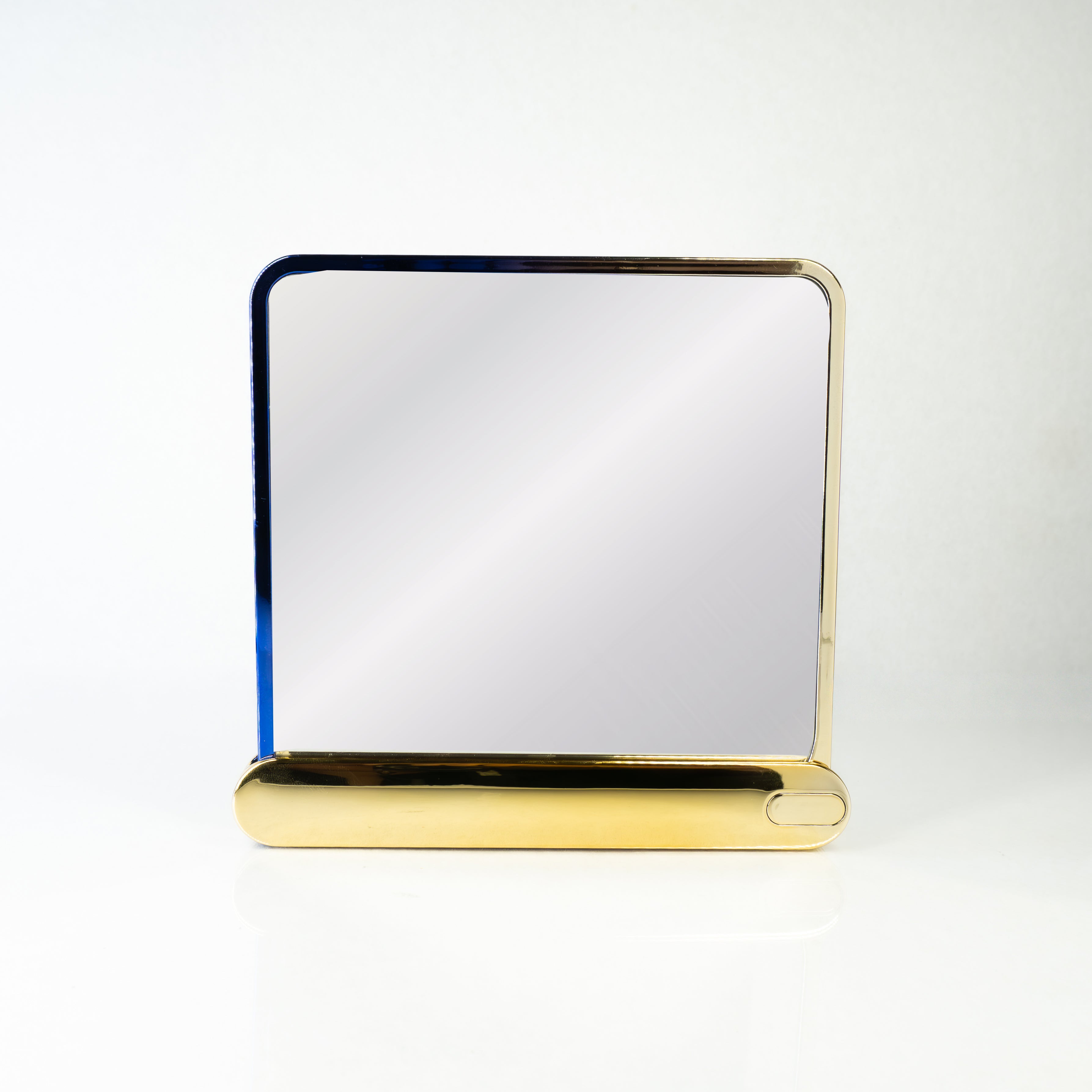 El Espejo Esencia, con su acabado degradado de azul profundo a dorado, aporta el toque de lujo que complementa cualquier rutina de maquillaje. Su formato 2 en 1 permite usarlo de mano o colocarlo sobre cualquier superficie como tocador.