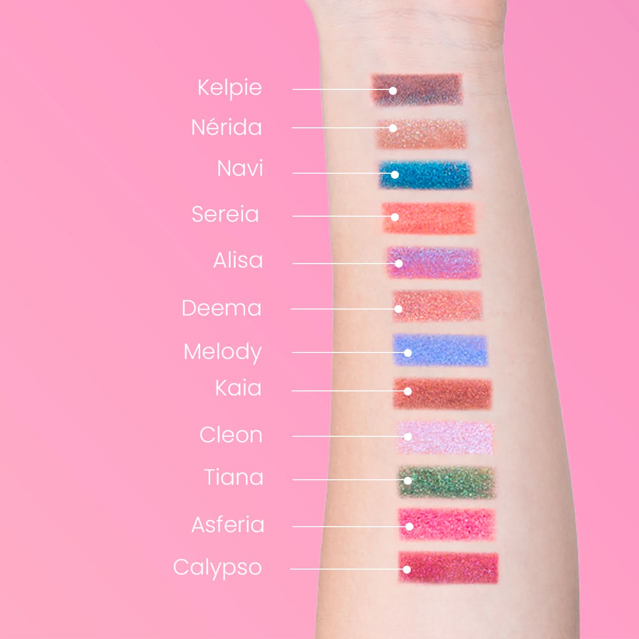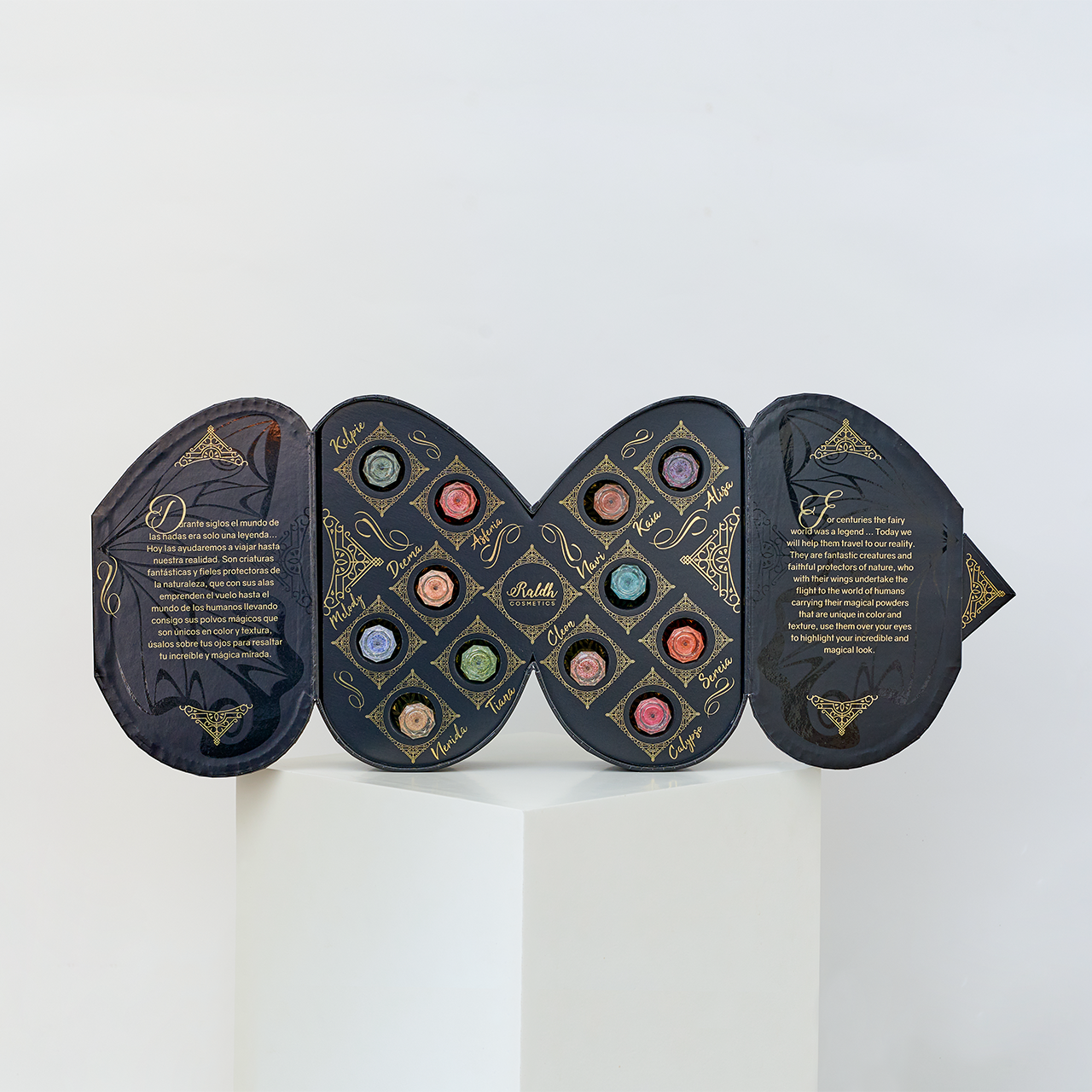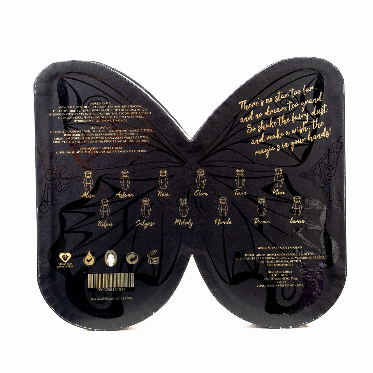 Set especial con todos nuestros Fairy Fantasy Pigments, 12 polvos de hada dúo cromáticos y tri cromáticos de fácil aplicación, con textura metálica híper reflejante para lograr un look único e impactante