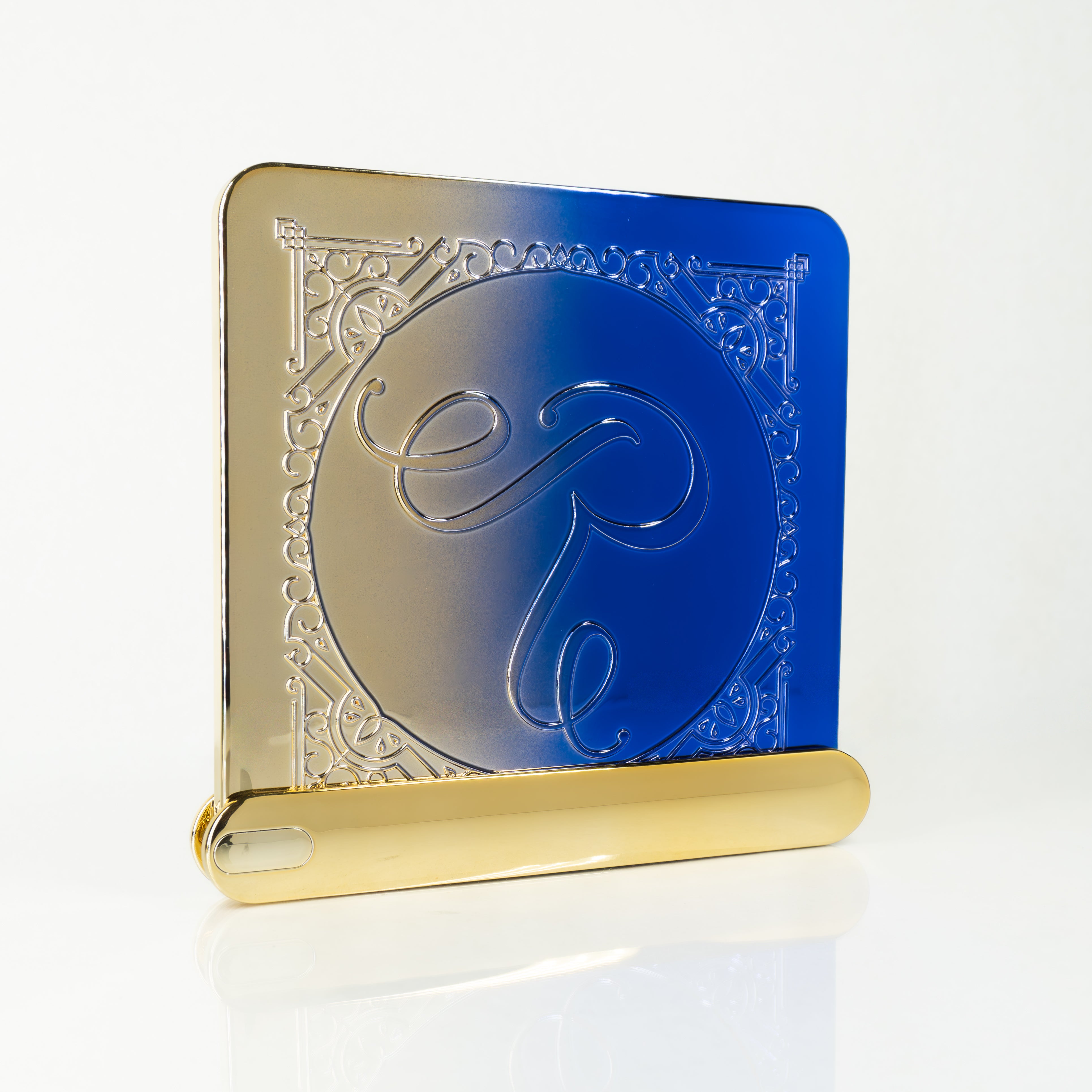🔹 Espejo Esencia – Edición degradado azul con dorado, diseño elegante 2 en 1: úsalo como espejo de mano o como tocador.